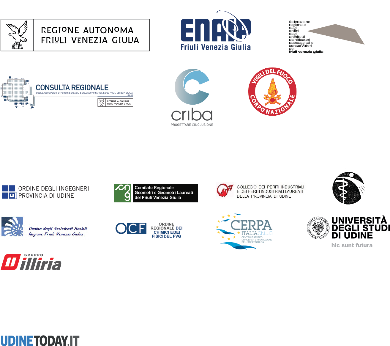 L'evento è organizzato da EnAIP FVG, Federazione Regionale degli Architetti, Consulta Regionale Associazioni Disabili FVG, Regione Autonoma Friuli Venezia Giulia, CRIBA FVG, Comando provinciale VVF di Udine, in collaborazione con Ordine degli Ingegneri di Udine, Comitato Regionale Geometri del Friuli Venezia Giulia, Collegio dei Periti Industriali e Periti Industriali laureati di Udine, Ordine dei Medici Chirurghi e degli Odontoiatri di Udine, Ordine Assistenti sociali del Friuli Venezia Giulia, Ordine Regionale dei Chimici e dei Fisici del Friuli Venezia Giulia, CERPA Italia Onlus, Università degli Studi di Udine.