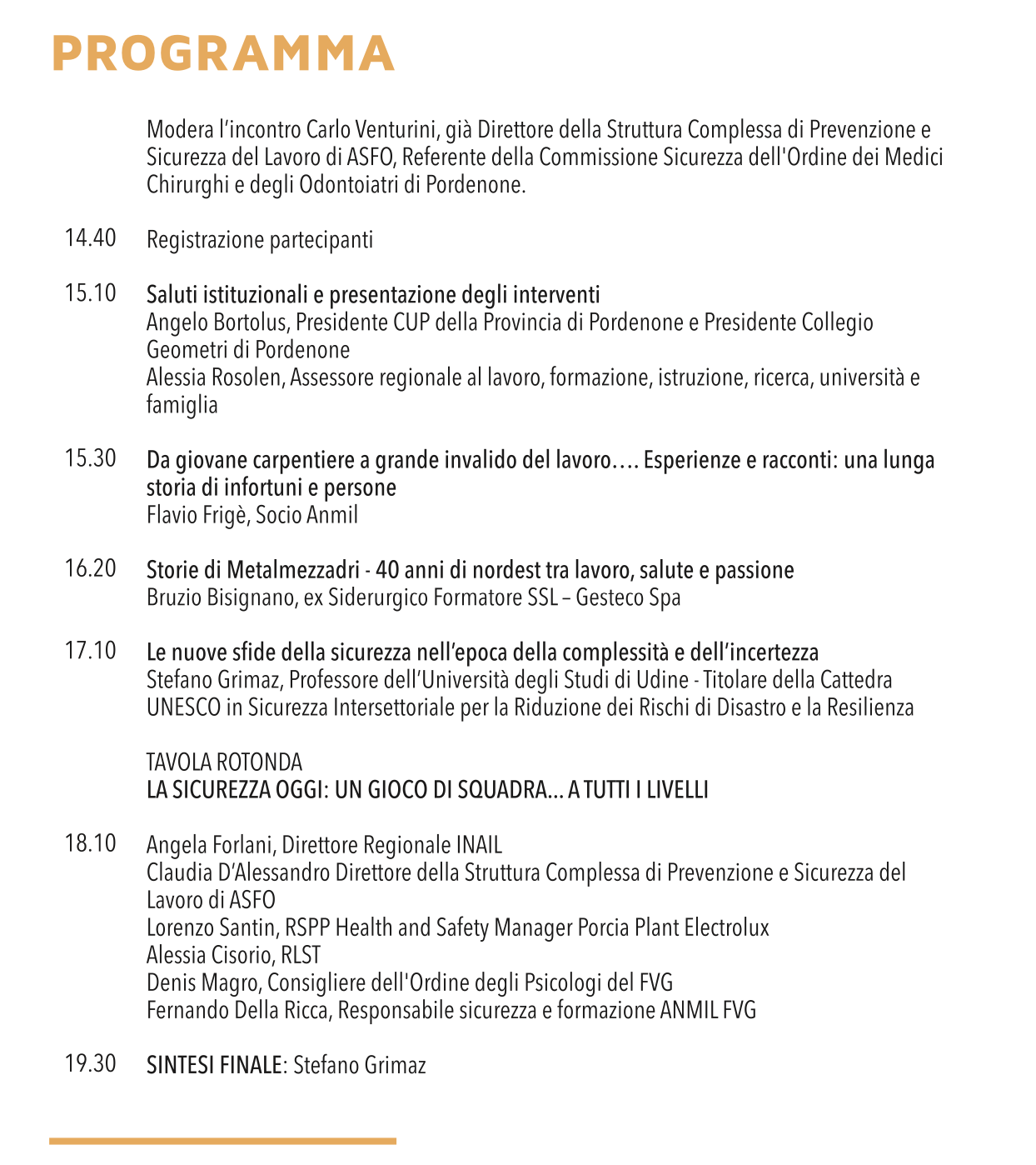 Chiude l'evento una tavola rotonda che ha il compito di condividere riflessioni, spunti e considerazioni da parte di attori che portano il proprio contributa da punti di vista diversi, ma tutti focalizzati sul tema: il valore della sicurezza.