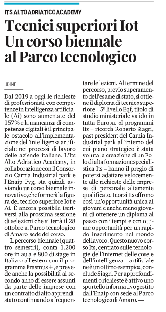 È stato presentato all’EnAIP di Pasian di Prato il corso ITS "Tecnico Superiore IoT e Intelligenza Artificiale" per il biennio 2024-2026, una formazione innovativa che prepara esperti in soluzioni digitali avanzate. Questo profilo professionale si occupa di sviluppare sistemi basati su IoT e Intelligenza Artificiale, con applicazioni nell’industria, logistica, smart city e sanità.